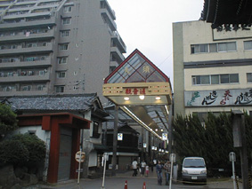 | 大須商店街の「大須観音」側入り口。なんとなく怪しげ。 | あるおもちゃやの店頭 何故か2つモニターの上はあずまんがで下はクレクレタコラ |